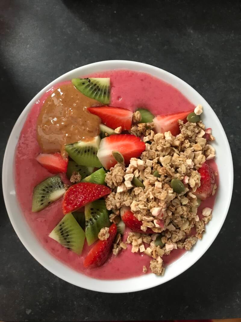 Mixa ihop alla ingredienser, man kan behöva tina mangon och hallonen litegrann för att det ska gå ihop. Är som den är eller toppa med exempelvis bär, granola och jordnötssmör.