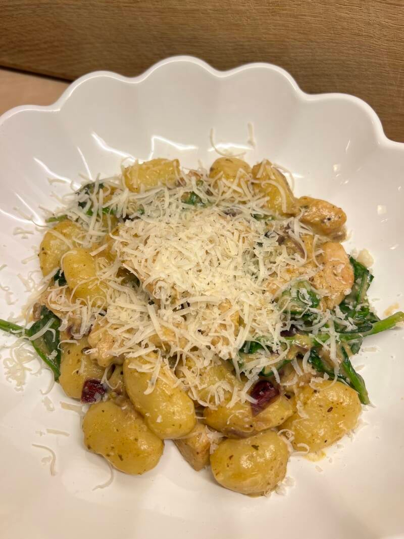 Stek kyckling, tillsätt lök och kryddor. Koka gnocchin och tillsätt den tillsammans med resten av ingredienserna. Toppa med riven parmesan.