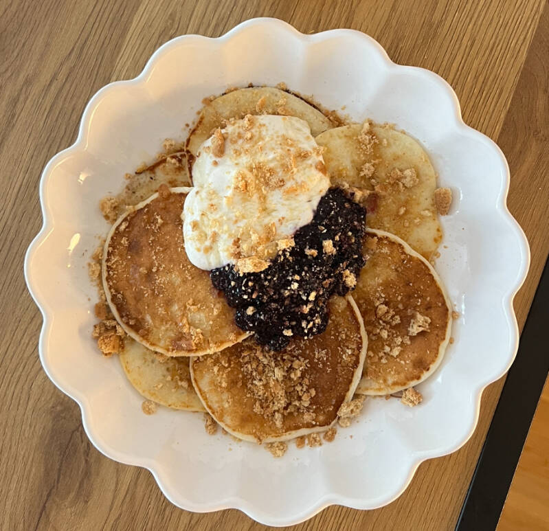 Börja med kompotten, tillsätt alla ingredienser till en kastrull och koka upp, ställ åt sidan och låt svalna medan du gör pannkakorna.