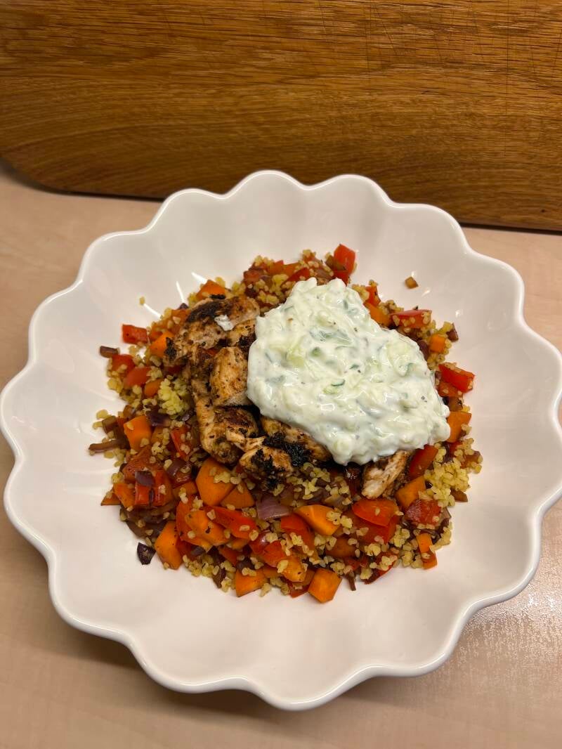 Varm bulgursallad med marinerad kyckling & tzatzikiđ„