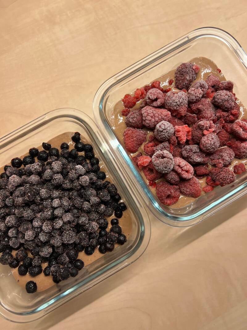 Blanda ihop alla ingredienser förutom bären till en slät smet, häll upp i en skål/matlåda och toppa med bären. Låt stå i kylen över natten eller ät direkt.