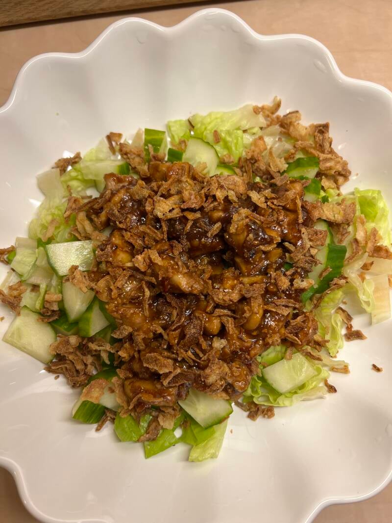 Krispig sallad med krämig kyckling i jordnötssås🥜🥬