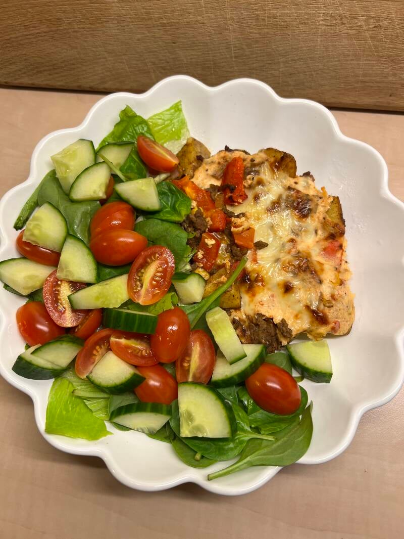 Häll upp ugnsstekt potatis i en ugnsform, häll på nötfärsblandningen, såsen och riven ost. Grädda i cirka 20 minuter tills osten har fått fin färg. Servera gratängen med sallad.