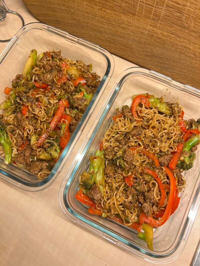 Stek nötfärs, skär upp paprika och broccoli och tillsätt till pannan, pressa ner vitlök och krydda med salt och peppar. Koka nudlarna, tillsätt dem tillsammans med sweet chili, soja, teriyakisås och jordnötssmör.