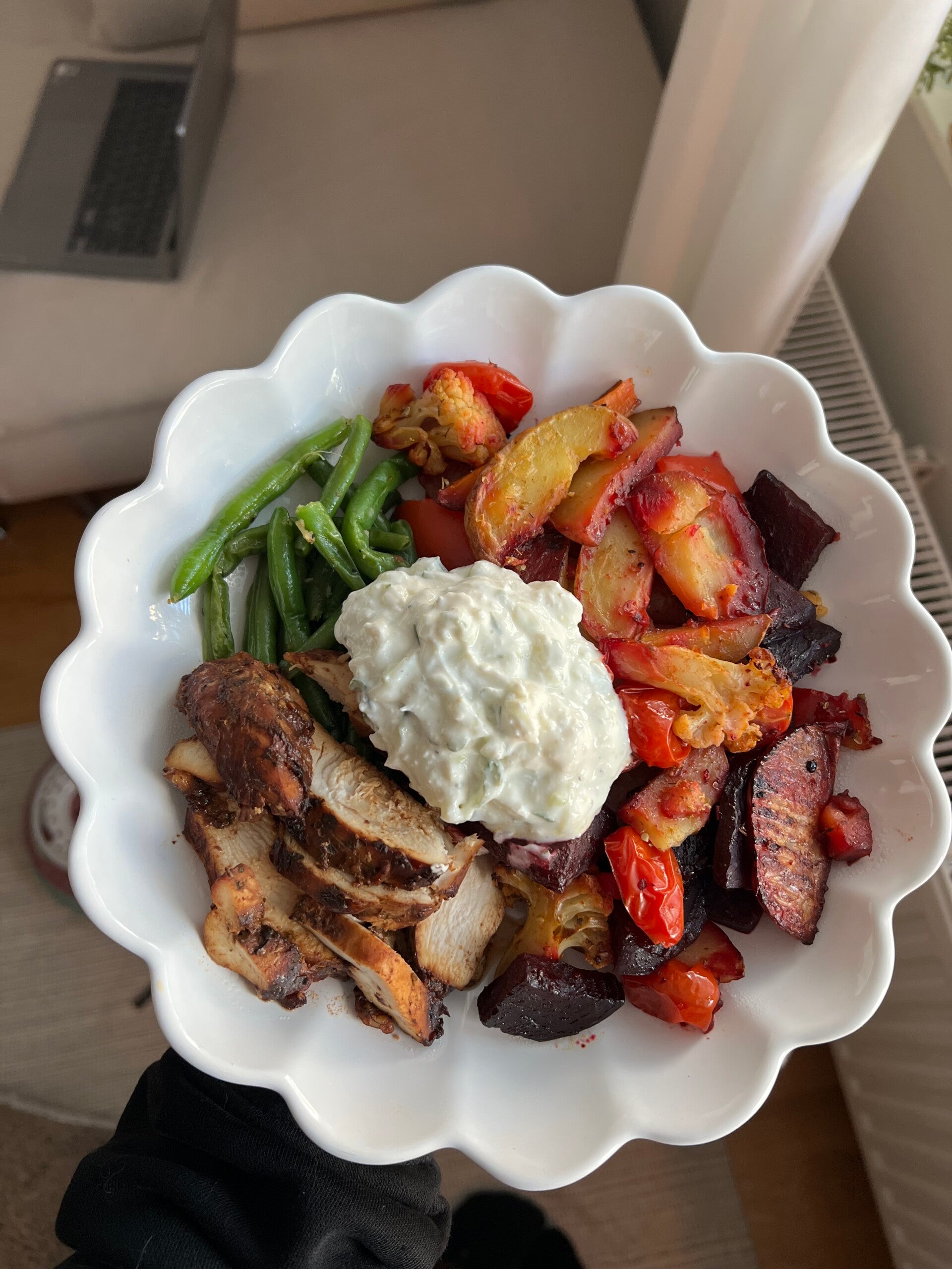 Marinerad kyckling, ugnsstekta rotfrukter, vitlöksstekta haricot verts och tzatzikiđ„