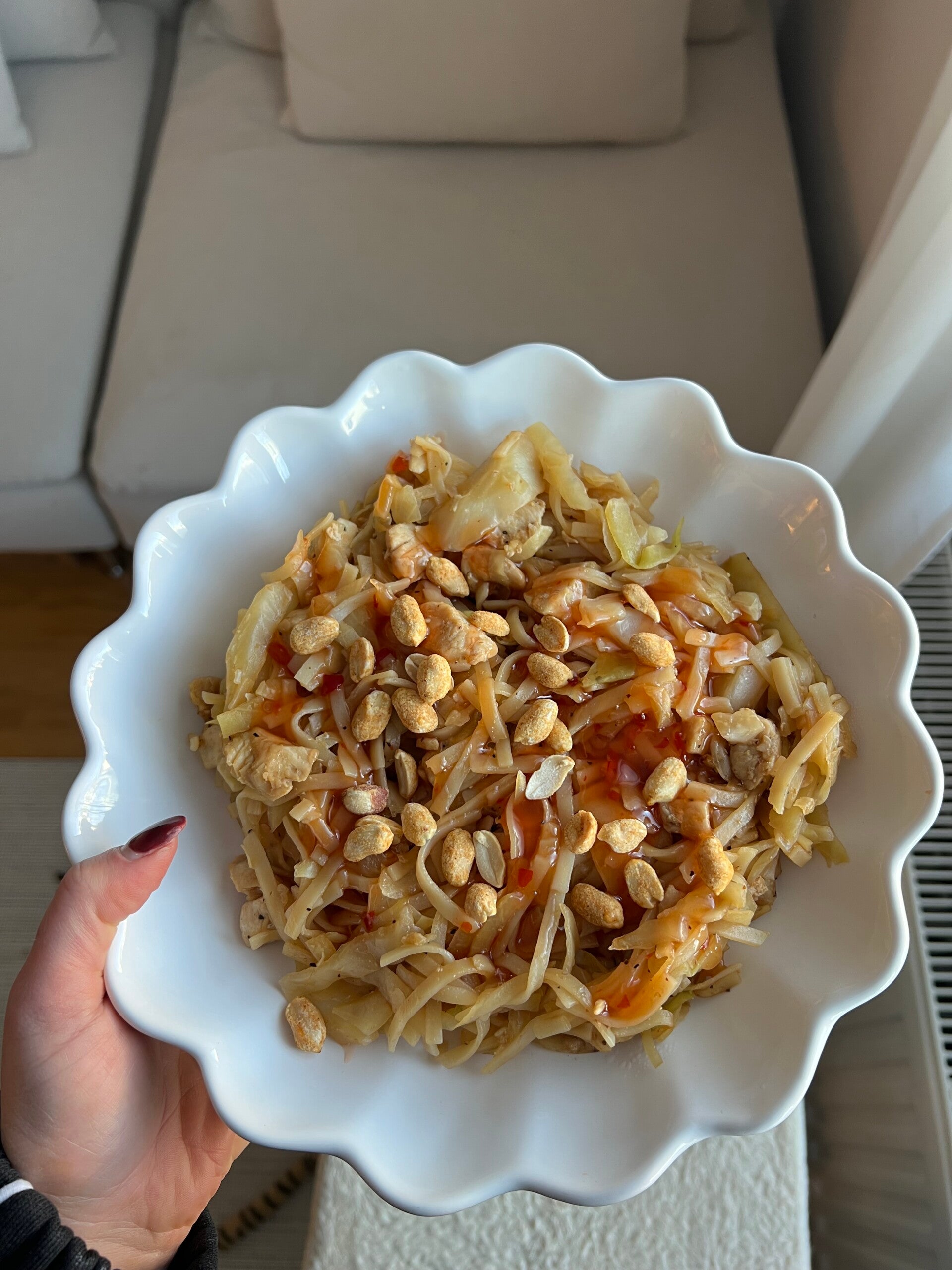 Koka risnudlarna. Blanda sedan ihop nudlar, vitkål, kyckling, soja och sweet chili. Toppa med jordnötter.