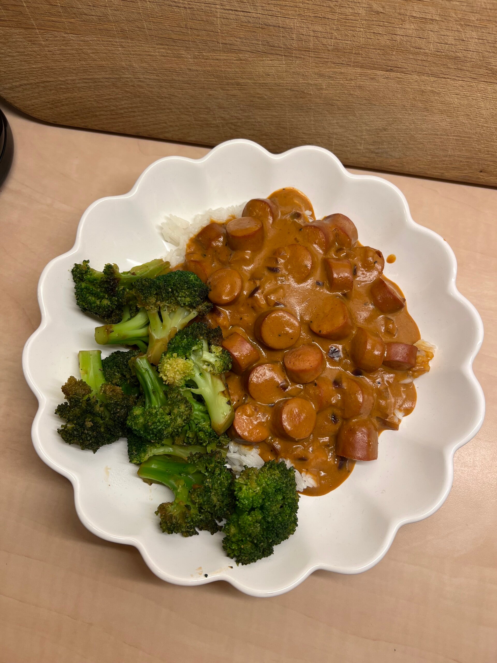Koka riset, stek korv, hacka lök och stek tillsammans med korven. Tillsätt tomatpuré och låt steka någon minut. Blanda sedan ner grädde, chilisås, soja, senap och kryddor. Stek broccoli med salt, peppar och lite soja. Servera stroganoffen med ris och broccoli.