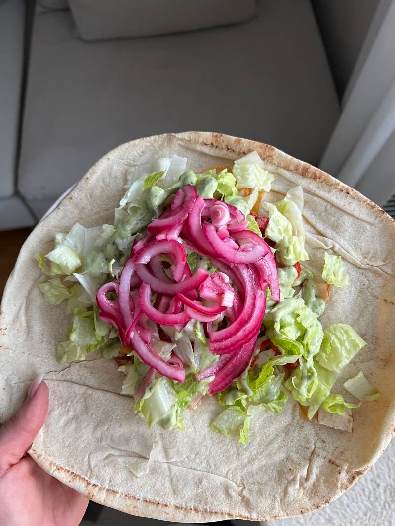 Kycklingwrap med hummus, stekta grönsaker och picklad rödlök.